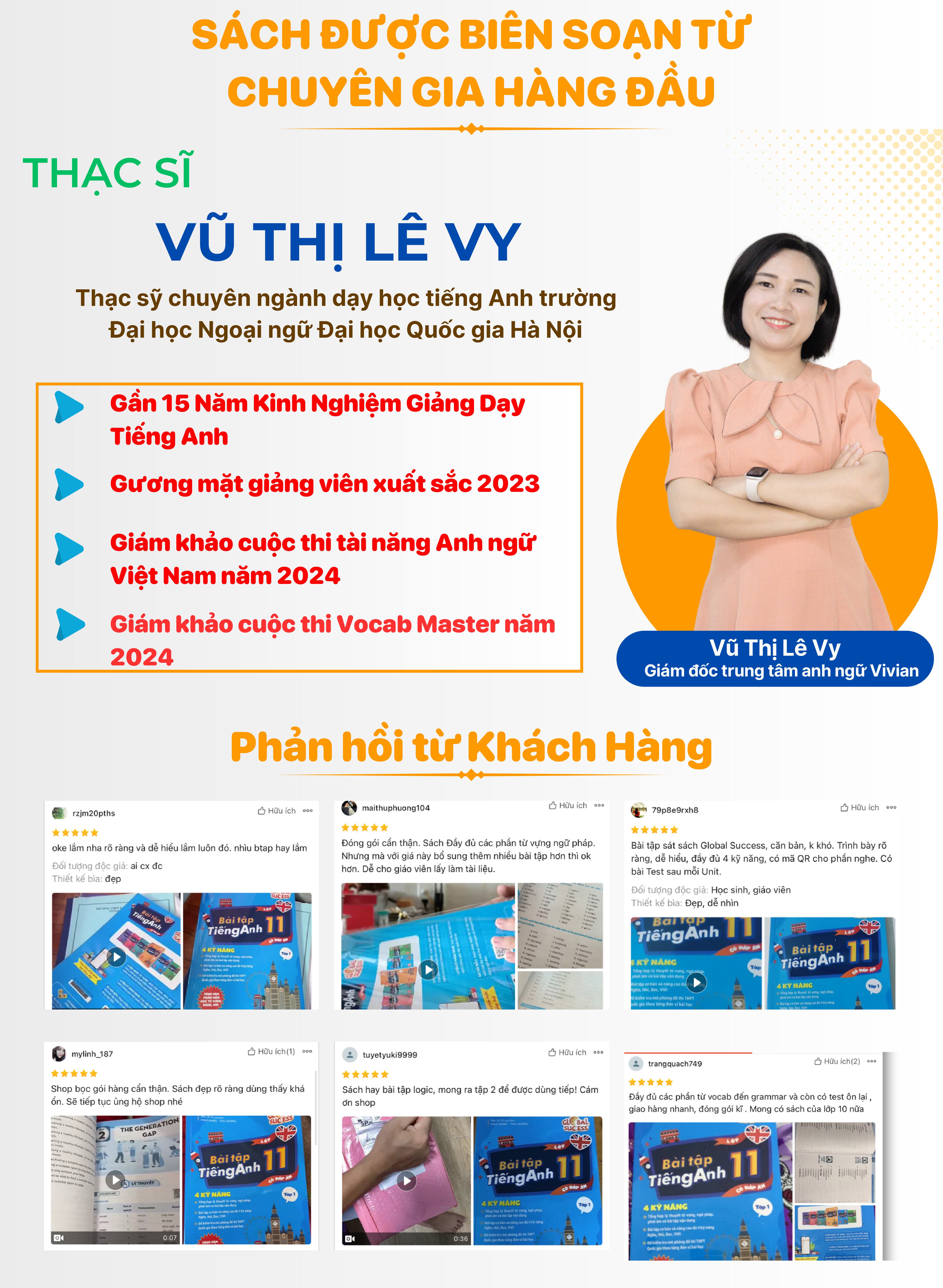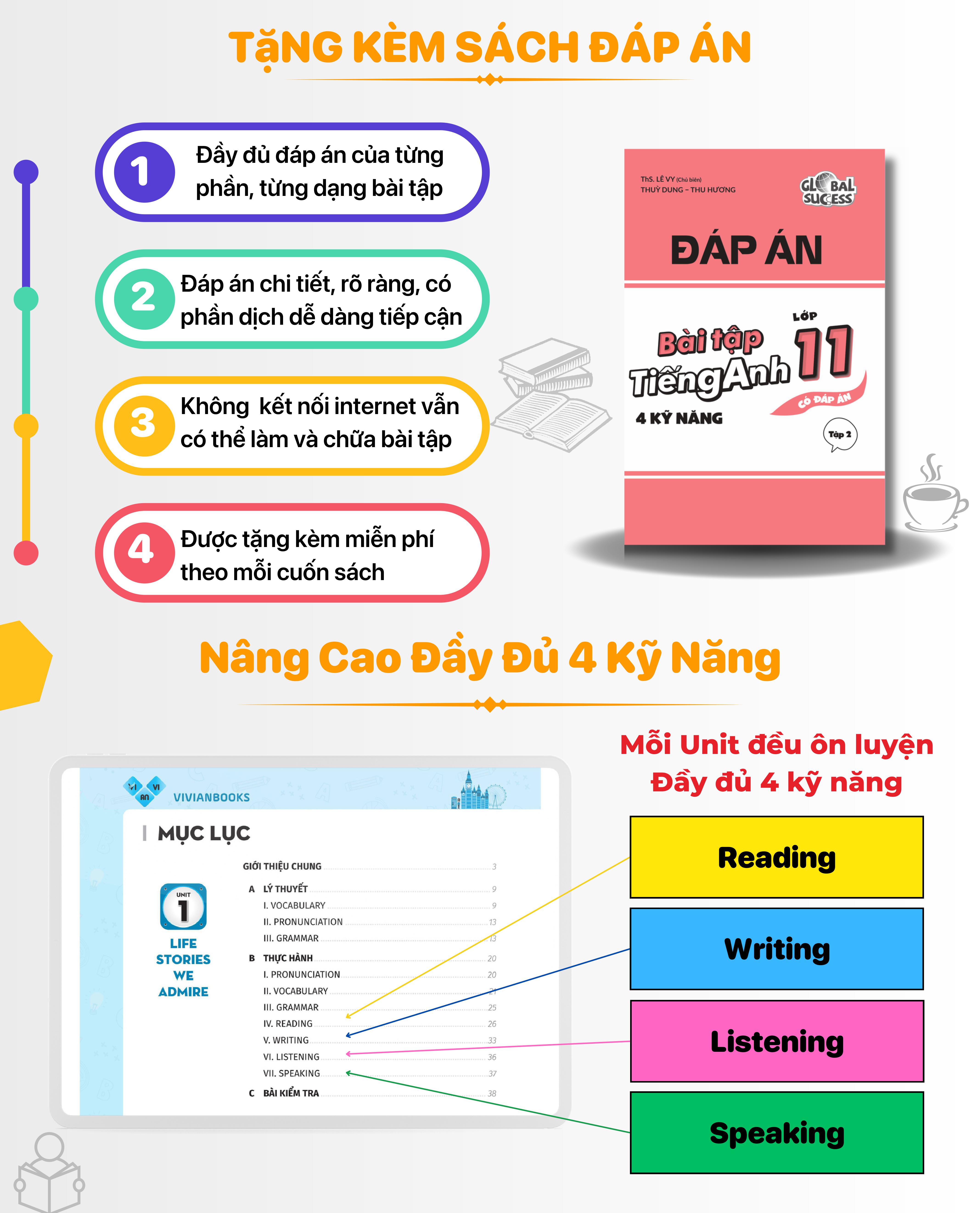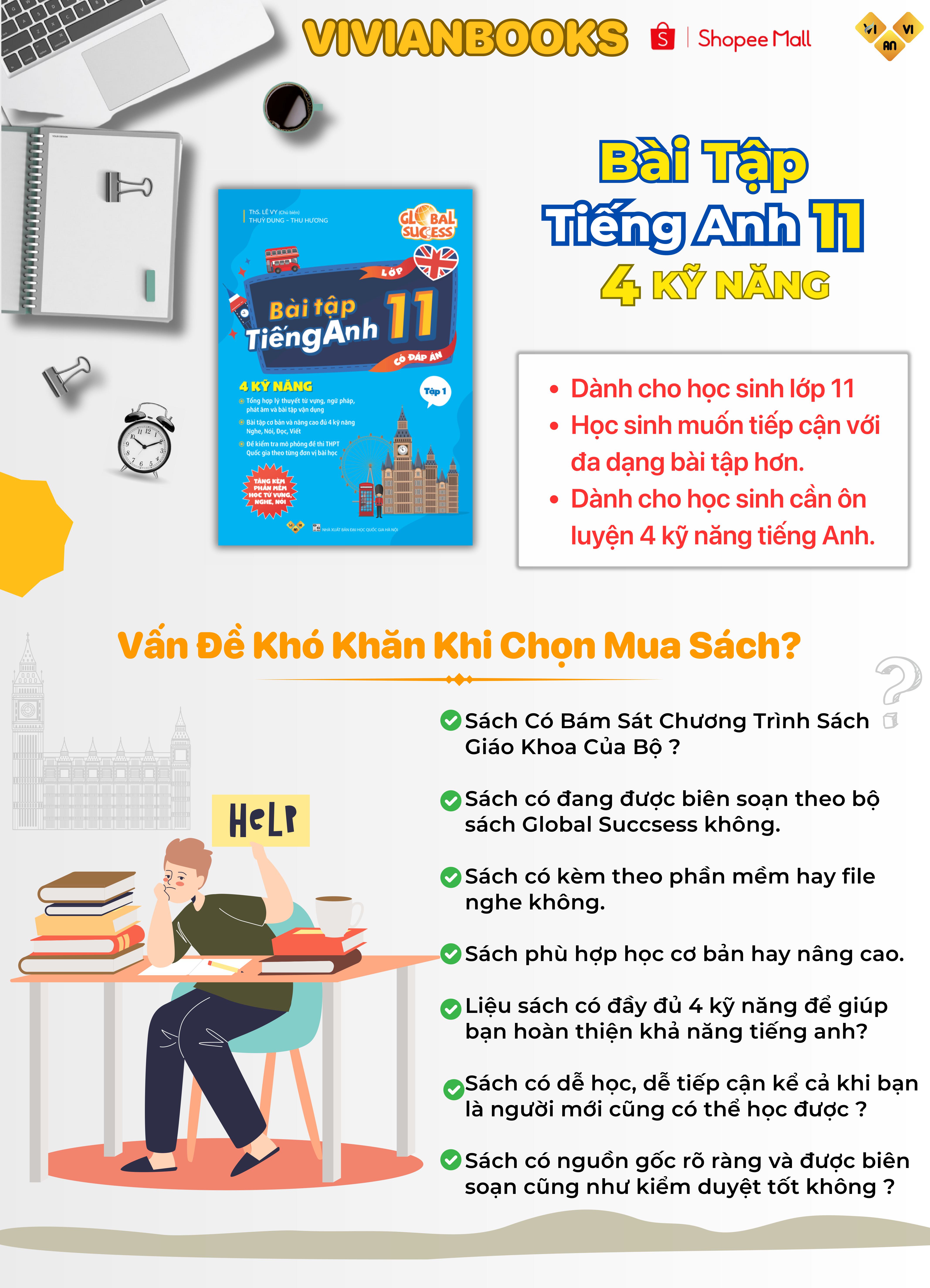 Cuốn sách Global Success - Bài tập tiếng Anh lớp 11, 4 kỹ năng (Có đáp án) - Tập 1 là sản phẩm của đội ngũ Anh ngữ Vivian và kiểm duyệt xuất bản tại NXB Đại học Quốc gia Hà Nội.