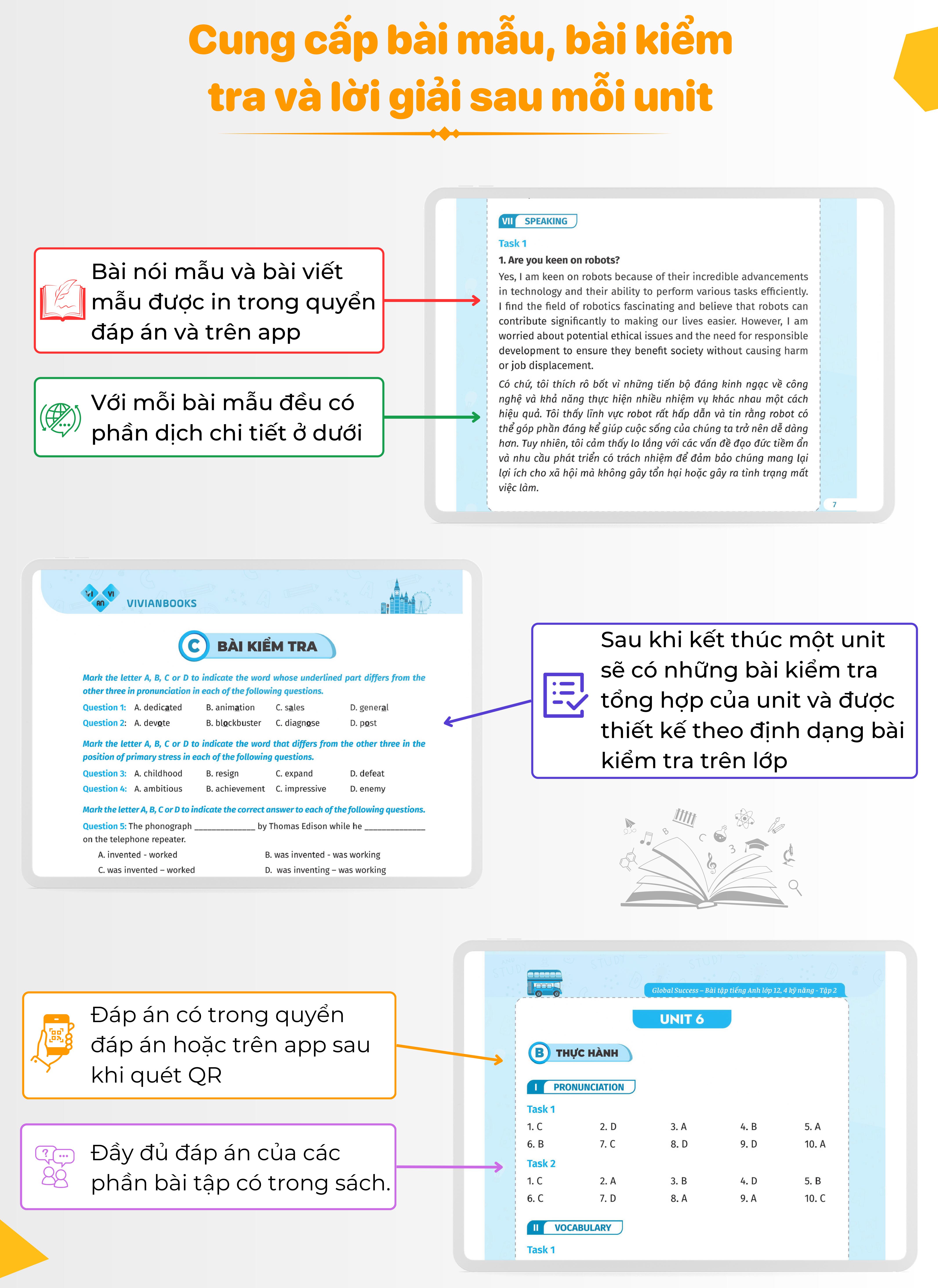 Phần bài kiểm tra tiếng Anh thiết kế theo định dạng bài thi THPT Quốc gia vừa giúp các em ôn tập các kiến thức đã học trong từng đơn vị bài học, vừa giúp các em nắm vững cấu trúc bài thi và chuẩn bị tốt nhất cho kỳ thi THPT sắp tới.