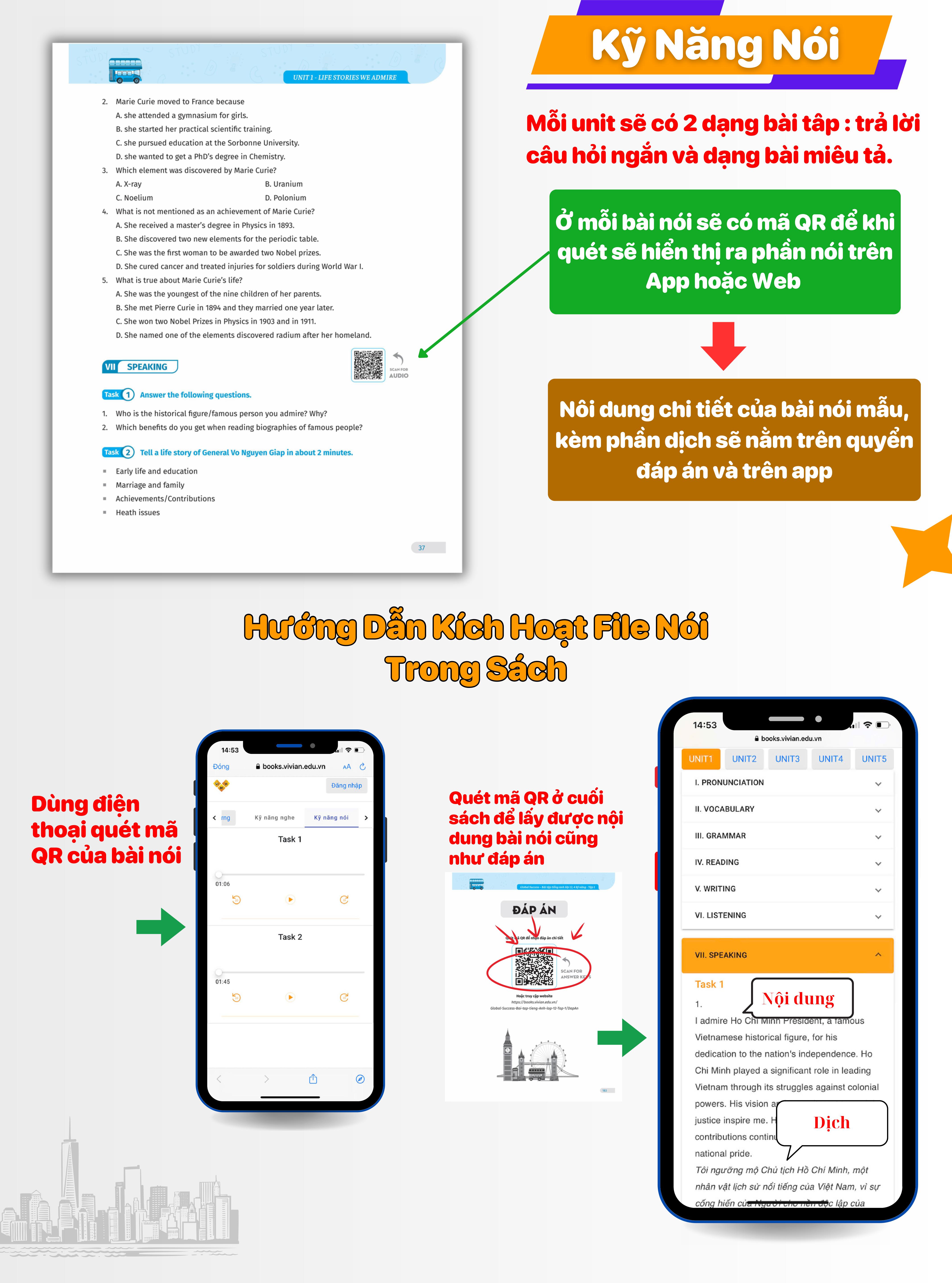Phần mềm học cùng sách bao gồm mã QR học từ vựng, luyện nghe và nói tiếng Anh theo từng đơn vị bài học.